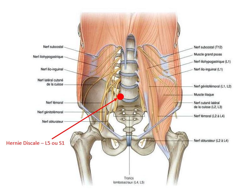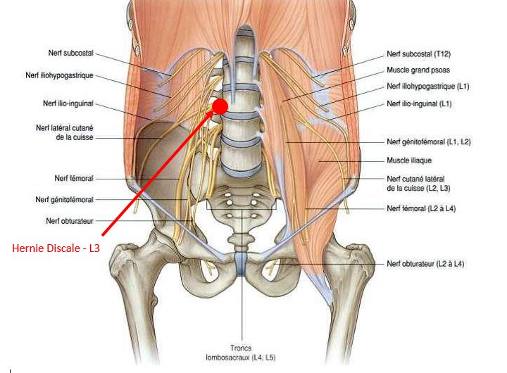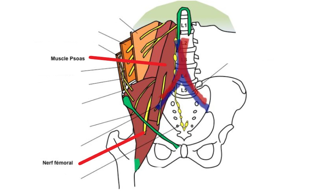 Le 2ème cas aura pour différence que la douleur ne sera pas provoquée par une hernie discale mais par un spasme du muscle psoas qui reçoit les fibres nerveuses du nerf fémorale.
